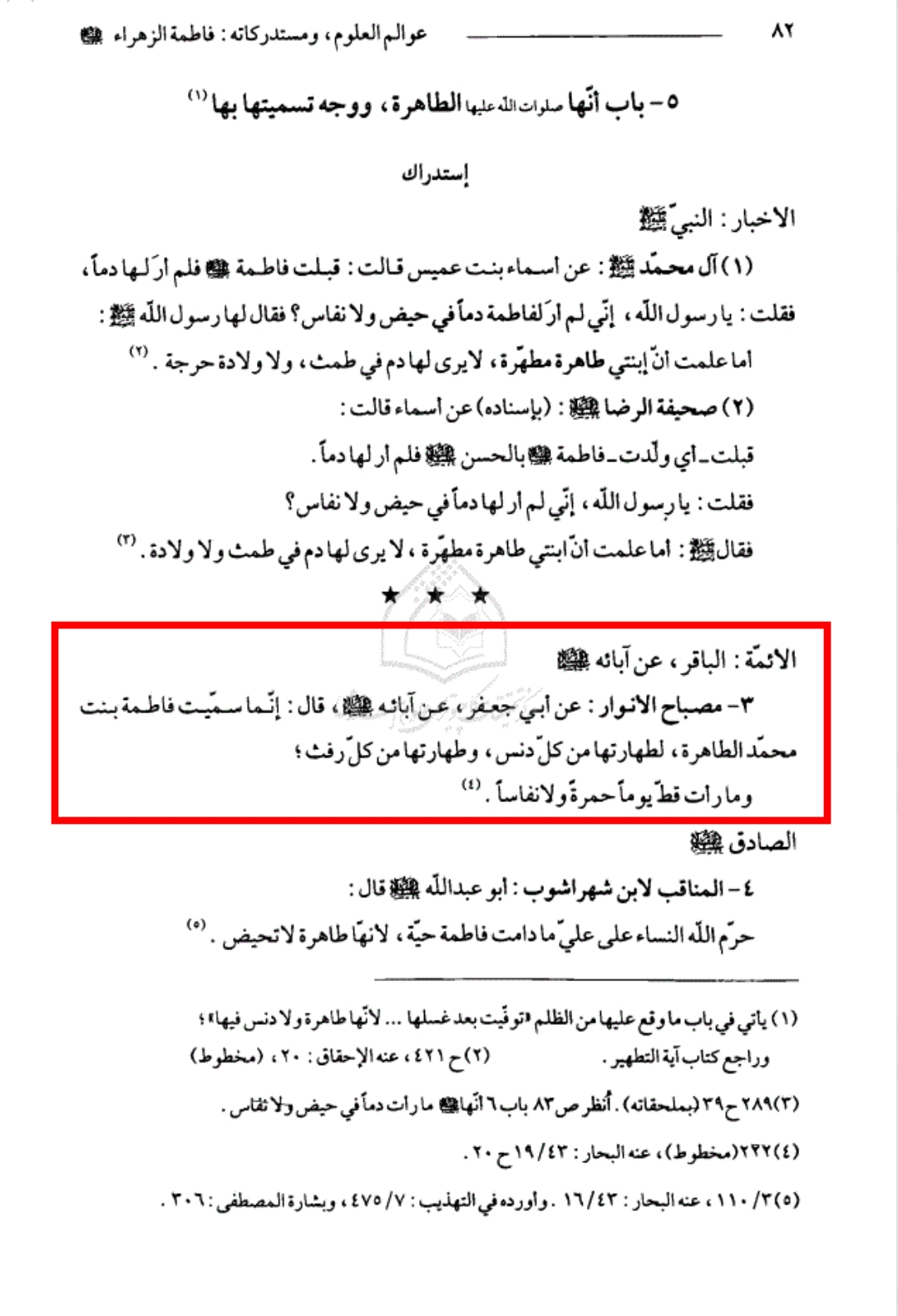 مصباح الأنوار: عن أبي جعفر، عن آبائه عليهم السّلام، قال: إنّما سُمّيت فاطمة بنت محمّد الطاهرة، لطهارتها من كلّ دنس، و طهارتها من كلّ رفث؛ و ما رأت قطّ يوماً حمرةً ولا نفاساً.